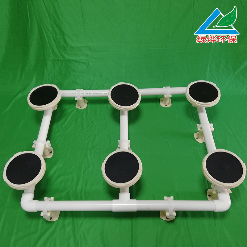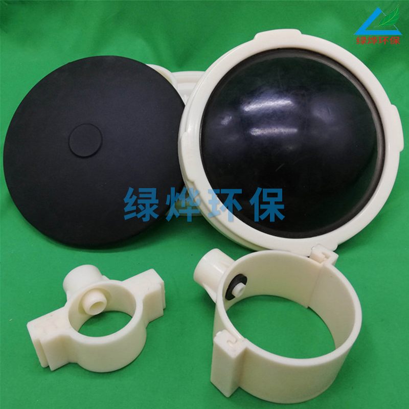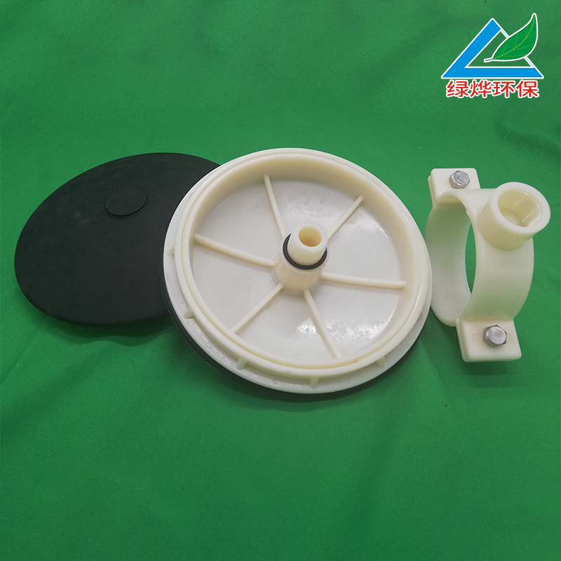 微孔曝气器也称曝气器、曝气头、曝气盘,其设计成略凸起拱形面,采用ABS工程塑料为主体,膜片具有搞附着表面的专用进口橡胶(EPDM),通过特殊加工制成,保证孔的质量和精度。曝气器在充氧曝气时,主体盘面设计了四条送气槽,使进入的空气通过止回阀缓冲后直接送至曝气头中央,保证膜片一次性低阻力轻松打开。膜片采用罗纹反锁机械化装配,确保膜片不脱落。