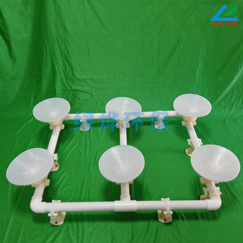 旋混式曝气器主要组成:多层锯齿布气头,螺旋切割系统及连接管。采用多层螺旋切割的型式进行充氧曝气,当气流进入混流型曝气器时,气流首先通过二道螺旋切割系统,切割后进入下层的的多层锯齿型布气头,进行多层切割,使气泡切割成微气泡,这样大大提高了氧的利用率,具有布气均匀,充氧效率高的特点。